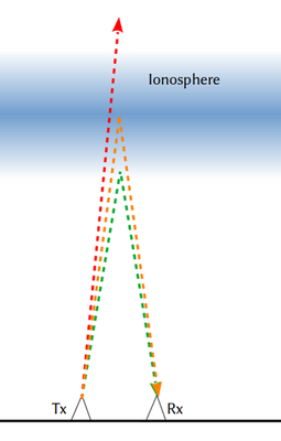 This is shown in Figure 1. The lowest frequency — shown in green — is reflected at the bottom of the ionosphere, where the electron density is low. A higher frequency — shown in orange — is reflected at the height where the maximum electron density occurs. This is called the critical frequency. Radio waves with frequencies that are higher than the critical frequency — such as the one shown here in red — are not reflected and escape into space.